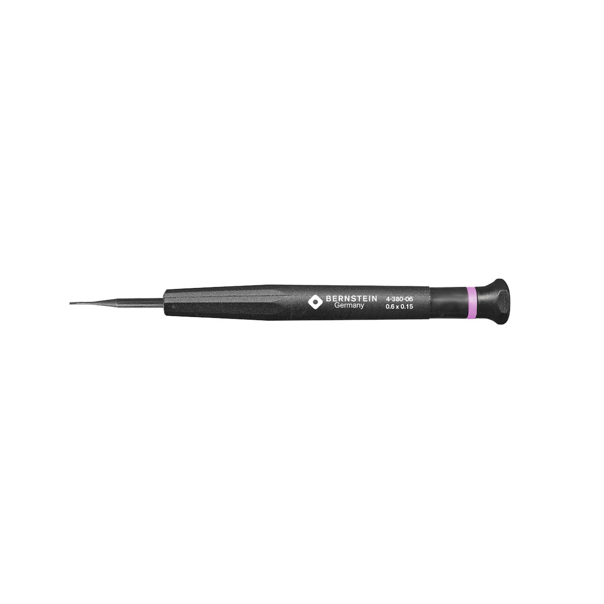 Fine screwdrivers are also called micro screwdrivers and are used in precision mechanics for small screw sizes or miniature screws. The hard precision blade made of quality tool steel enables direct gripping of the miniature screw and provides optimum force closure. The sturdy plastic handle with rotation cap fits comfortably in the hand, the colored ring facilitates work by quickly recognising the required size.Blade (HRC 58-61) material molybdenum-vanadium steel, burnished black, handle material: plastic. Instructions: High humidity or touching burnished blades with your fingers (sweat) causes flash rust. Therefore, the blades should always be kept dry or rubbed with a drop of oil for storage. If such rust forms on the blade, it can be easily removed, with a slight ground.The classic watchmaker’s screwdriver is not only one of the most important tools for the watchmaker, but also for the precision mechanic, for the model maker or for hobby and tinkering. The precision screwdriver with rotating cap facilitates precise repeated screwing, turning, tightening or loosening thanks to its particular ease of movement. In addition, this product is nickel-free and 100% made in Germany.Precision blades for screw connections in precision engineeringergonomically shaped plastic handle with colored ring rotating capblade length 17 mmBlades � 2 mm, Handle � 9 mmBlades � 2 mm, Handle � 9 mmBlade width 0.6 mmBlade thickness 0.15 mmBlades Molybdenum-Vanadium Steel, hardened and burnishedLength 104 mmWeight 4 g