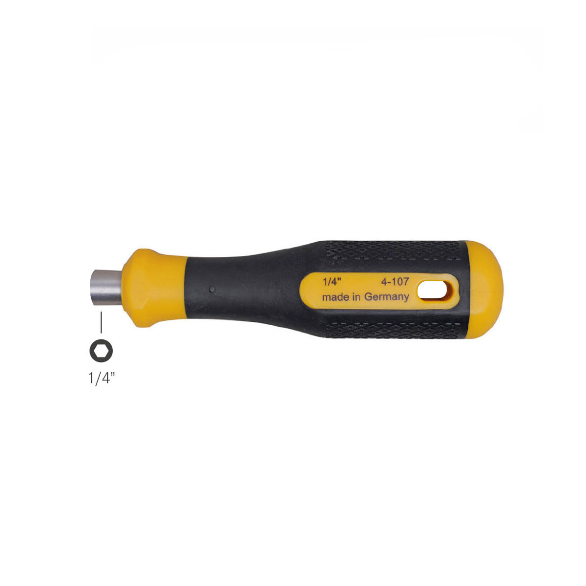 The bit magnetic holder handle has a 1/4 inch hexagon socket and can be used with all common hexagonal 1/4 inch bits. It is particularly suitable as a holder for our torque adapters. As an ergonomically shaped multi-component handle made of non-slip plastic, it lies well in the hand and has a practical hanging hole for your workbench.2-component handleergonomically shaped non-slipblade � 10.0 mmsocket SW 6,35 mm (1/4 inch)socket SW 6,35 mm (1/4 inch)material high-quality tool steellength 120 mmweight 58 g